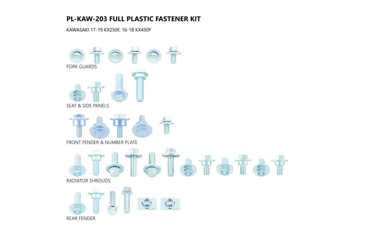 Βίδες UFO Σετ AC02434 KXF250 ’17-21, KXF450 ’16-18 Βίδες (ΣΕΤ) UFO AC02434 σε ασημί χρώμα. Συμβατές με ΚΑWASAKI KXF 250 ’17-21/KXF 450 ’16-18.