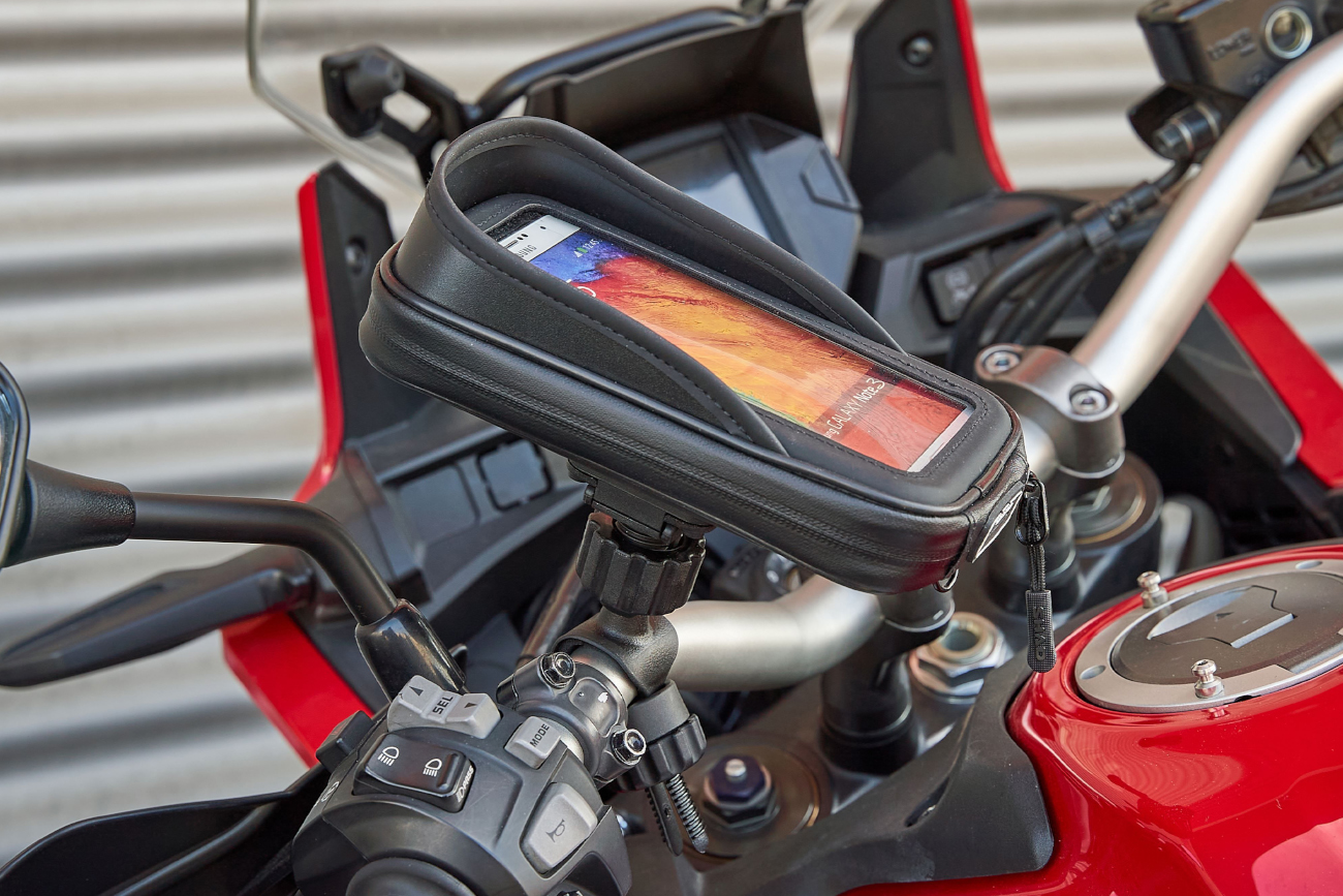 Η βάση κλειδώνει με ρυθμιζόμενο αντάπτορα στη μπάρα του τιμονιού της μοτοσικλέτας.