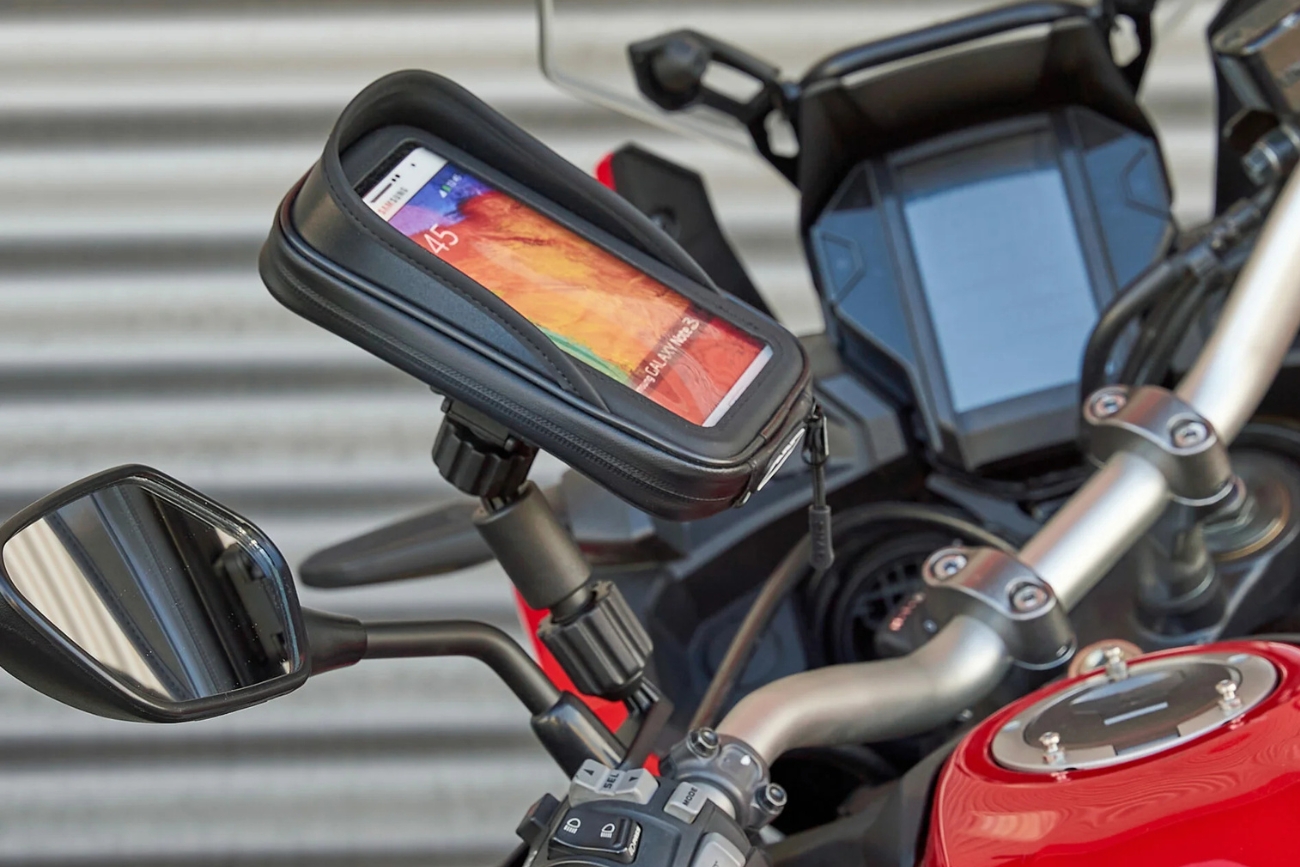 Η βάση κλειδώνει με ρυθμιζόμενο αντάπτορα στη μπάρα του τιμονιού της μοτοσικλέτας.